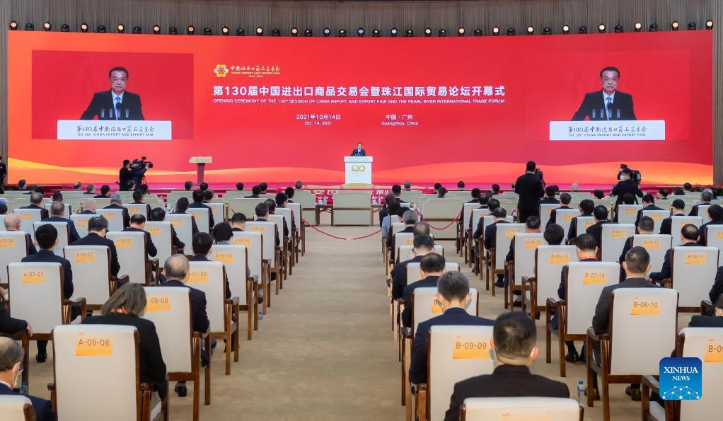 Chinese Premier Li Keqiang delivers a speech at the opening ceremony of the 130th Session of the China Import and Export Fair, or Canton Fair, in Guangzhou, south China's Guangdong Province, Oct. 14, 2021. (Xinhua/Zhai Jianlan)