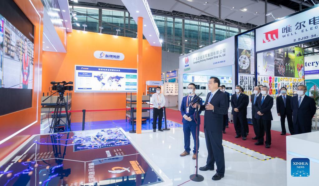 Chinese Premier Li Keqiang listens to the briefing on business from an expatriate employee based in Britain via video link at the pavilion of Fujian Zongteng Network Co., Ltd. on the 130th Session of the China Import and Export Fair, or Canton Fair, in Guangzhou, south China's Guangdong Province, Oct. 14, 2021. Li inspected some domestic and foreign exhibition pavilions and listened to their briefings on businesses after attending the opening ceremony of the Canton Fair. (Xinhua/Zhai Jianlan)
