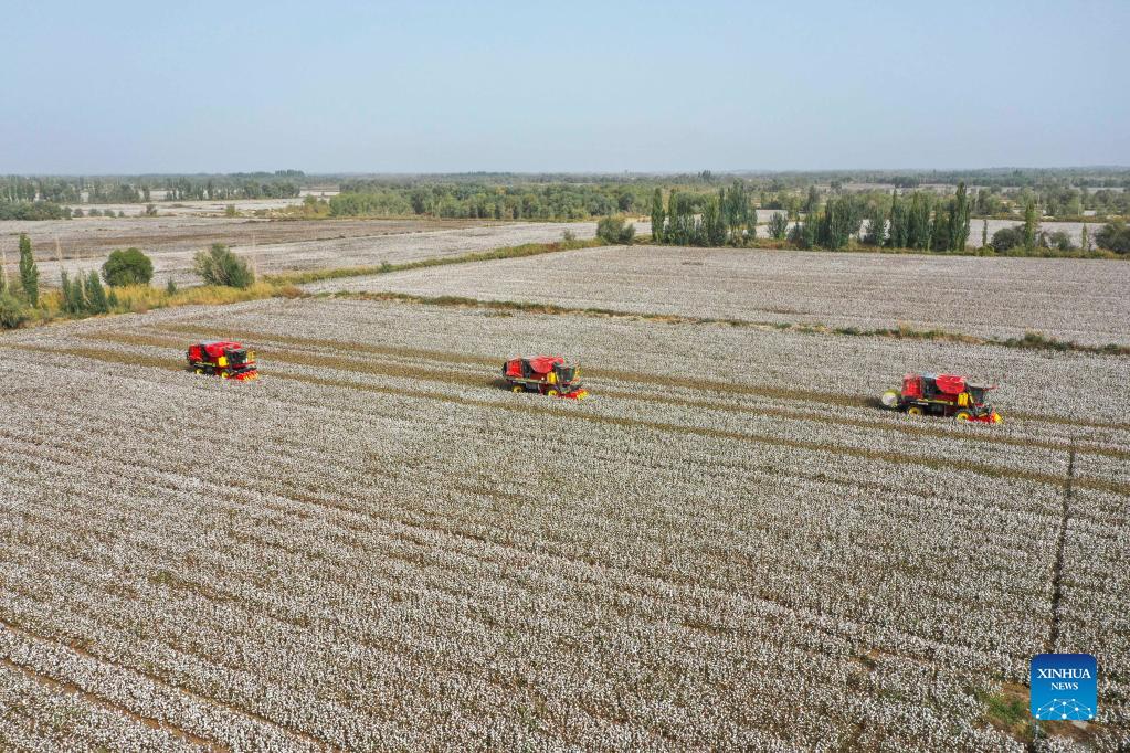 Cotton harvesters work at a cotton field in Yuli County in northwest China's Xinjiang Uygur Autonomous Region, Oct. 12, 2021. (Xinhua/Zhao Ge)
