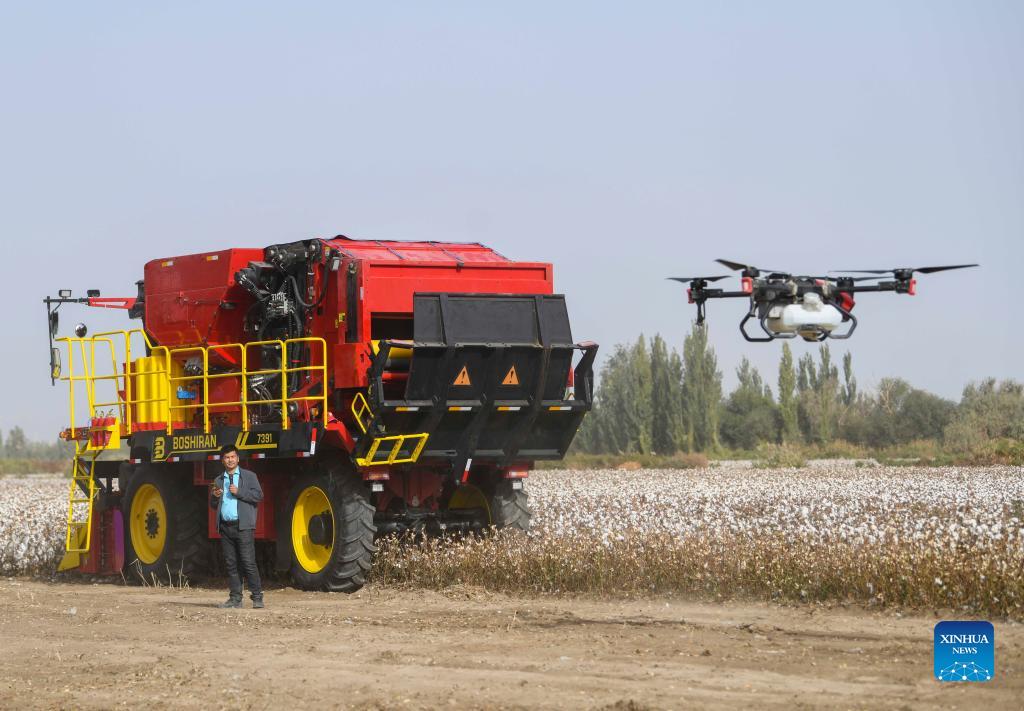 Vmarjan Barhan, a drone pilot, describes his job at a cotton field in Yuli County of northwest China's Xinjiang Uygur Autonomous Region, Oct. 12, 2021. (Xinhua/Zhao Ge)