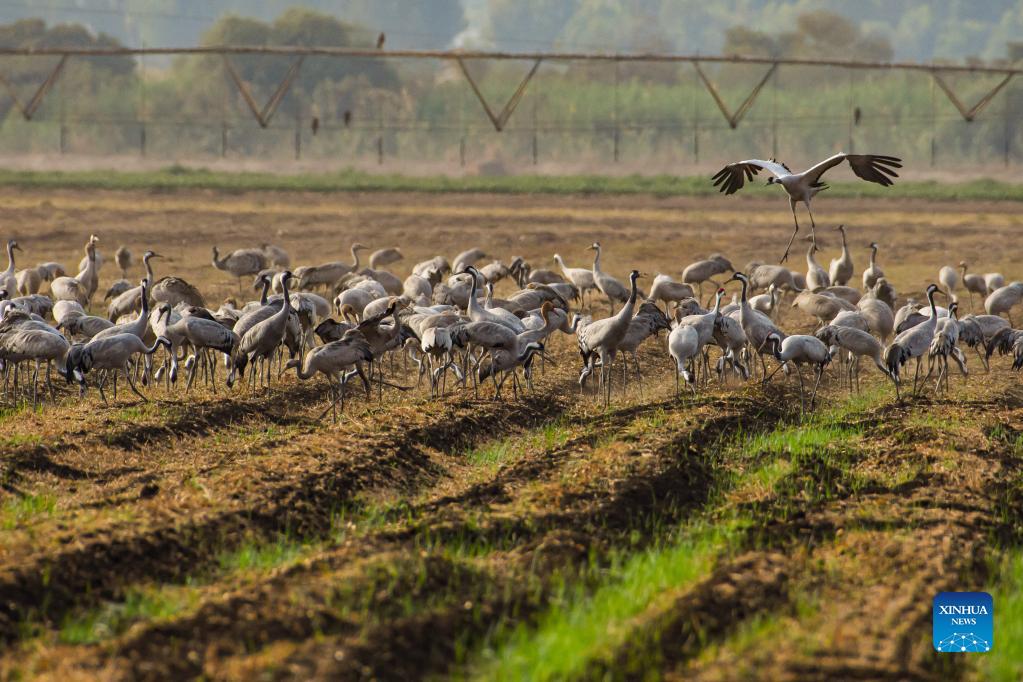 A flock of migrating gray cranes are seen at the Agamon Hula Conservation Lake in north Israel, Oct. 14, 2021. Every year, hundreds of thousands of birds past Agamon, a major stopover for migrating birds along the Syrian-African Rift, making their way to Africa then back to Europe, and some spend the winter at the Lake. (Photo by Ayal Margolin/JINI via Xinhua)