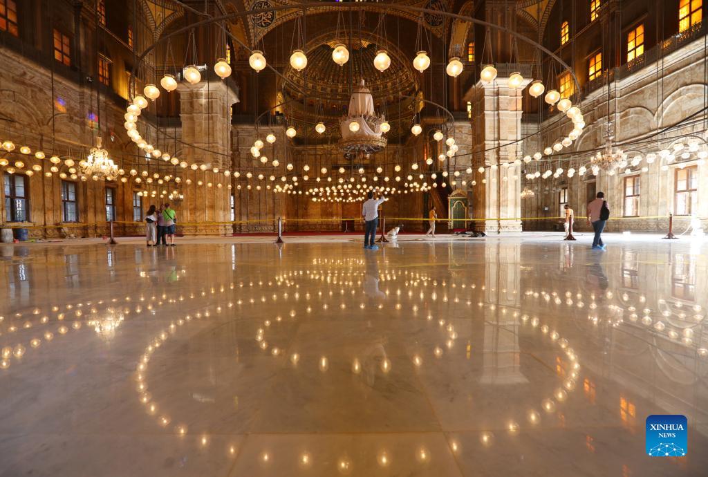 Tourists visit the Mosque of Muhammad Ali inside the Saladin Citadel in Cairo, Egypt, on Oct. 14, 2021. The Saladin Citadel, built by Saladin (1138-1193) in the 12th century, is an attraction for tourists in Cairo. (Xinhua/Sui Xiankai)