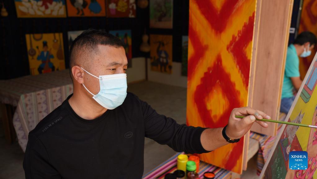 A farmer-painter draws a painting in Kumkusar Township of Makit County, northwest China's Xinjiang Uygur Autonomous Region, Sept. 27, 2021. (Xinhua/Zhang Xiaocheng)