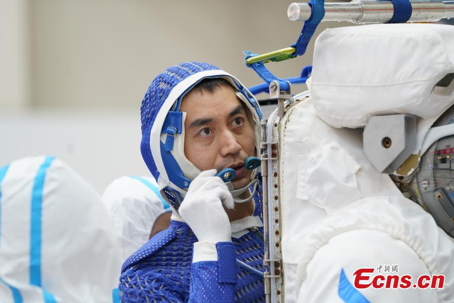 Chinese astronaut Ye Guangfu communicates by telephone before entering the underwater suit, Aug. 9, 2021. (Photo/Kong Fangzhou)