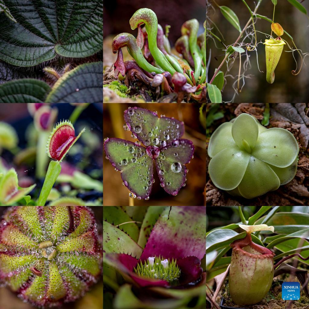 Undated combo photo shows insectivorous plants at the Fuligong Greenhouses in Kunming Botanical Garden in Kunming, southwest China's Yunnan Province. (Xinhua/Jiang Wenyao)