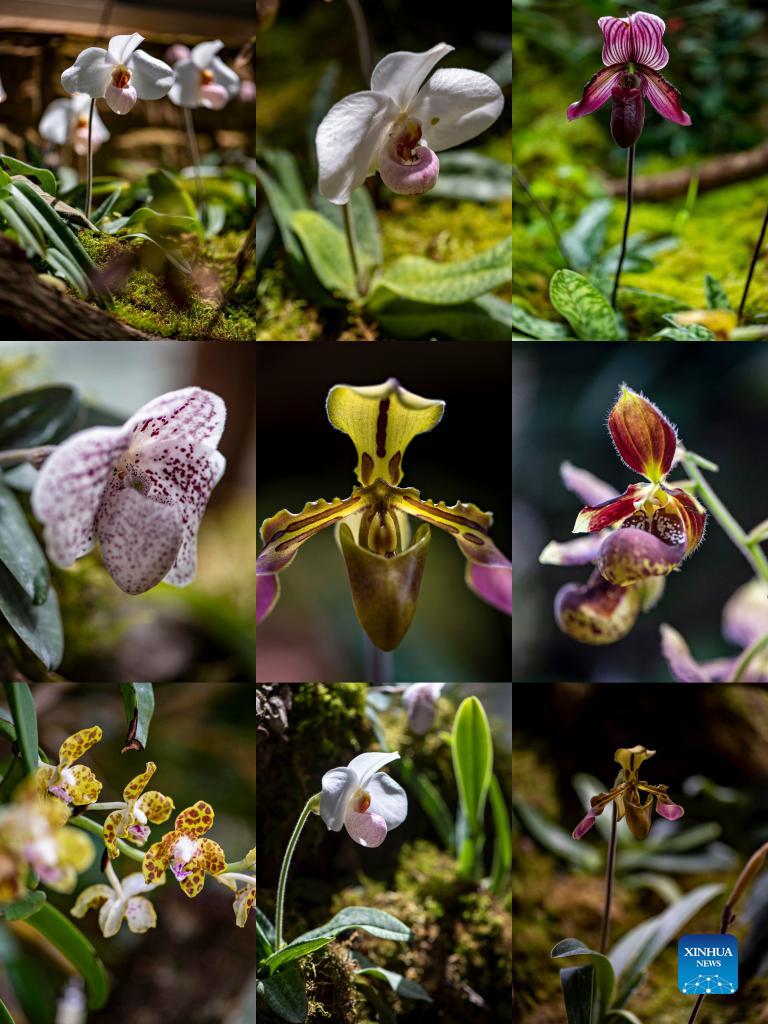 Undated combo photo shows orchids at the Fuligong Greenhouses in Kunming Botanical Garden in Kunming, southwest China's Yunnan Province. (Xinhua/Jiang Wenyao)