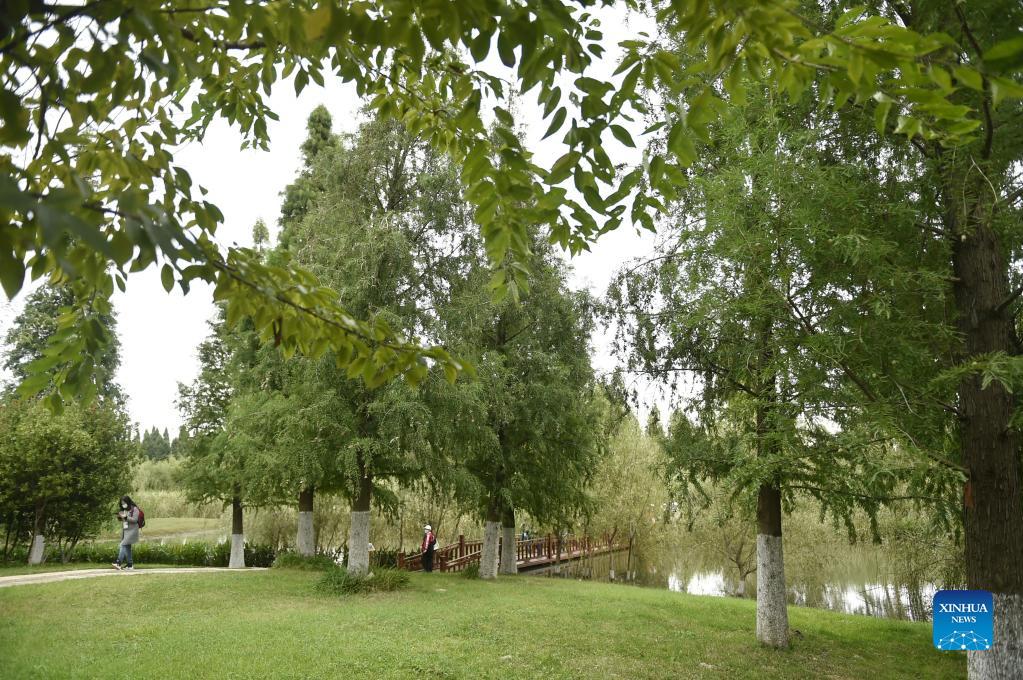 Photo taken on Oct. 15, 2021 shows a view of the Baofeng Peninsula Wetland in Kunming, southwest China's Yunnan Province. The wetland, about 108 hectares in size, is an outdoor exhibition project for the 15th meeting of the Conference of the Parties to the Convention on Biological Diversity, or the COP15. (Xinhua/Lu Peng)