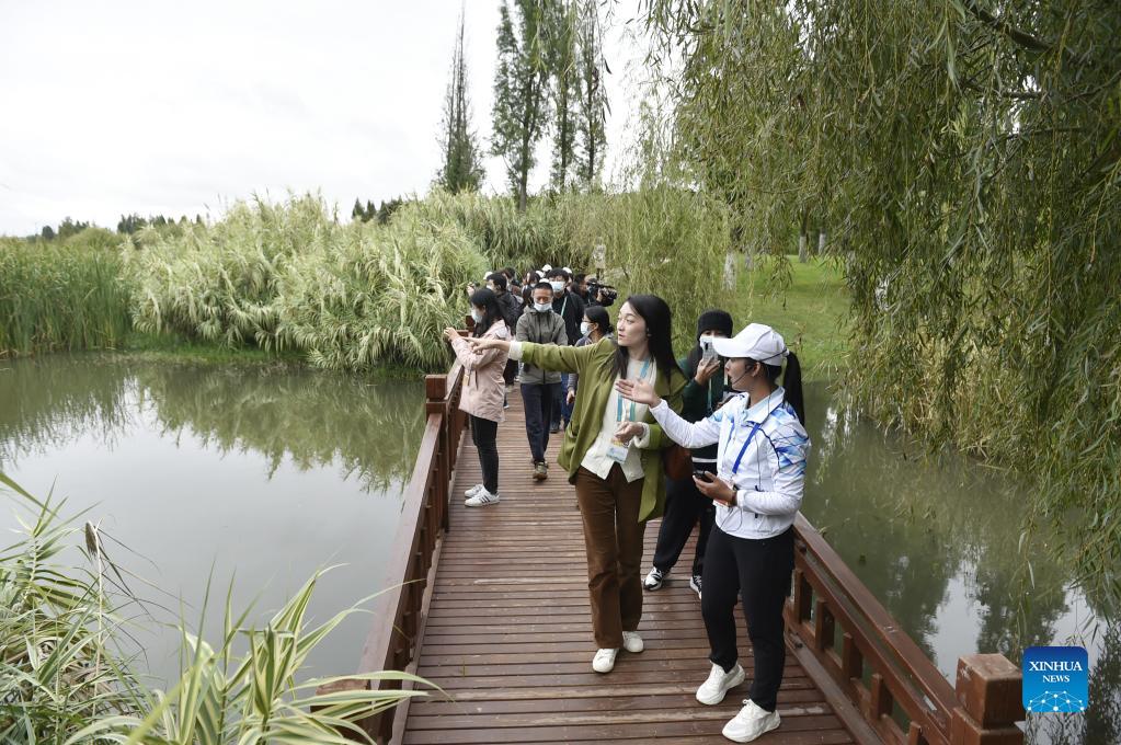 Journalists visit the Baofeng Peninsula Wetland in Kunming, southwest China's Yunnan Province, Oct. 15, 2021. The wetland, about 108 hectares in size, is an outdoor exhibition project for the 15th meeting of the Conference of the Parties to the Convention on Biological Diversity, or the COP15. (Xinhua/Lu Peng)