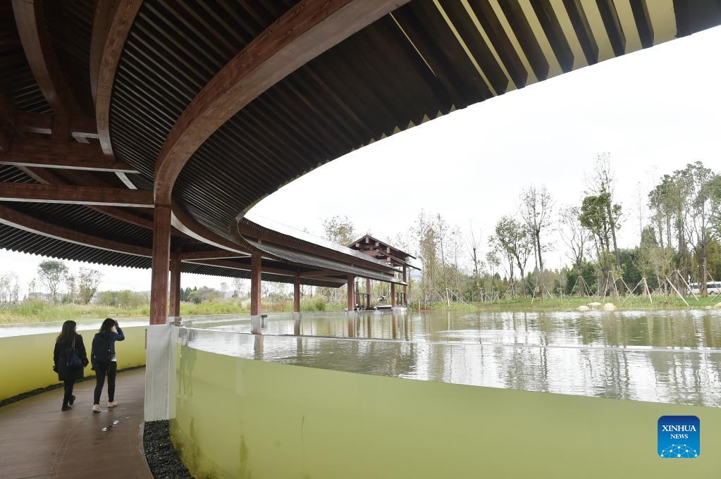 Photo taken on Oct. 15, 2021 shows a view of the Baofeng Peninsula Wetland in Kunming, southwest China's Yunnan Province. The wetland, about 108 hectares in size, is an outdoor exhibition project for the 15th meeting of the Conference of the Parties to the Convention on Biological Diversity, or the COP15. (Xinhua/Lu Peng)