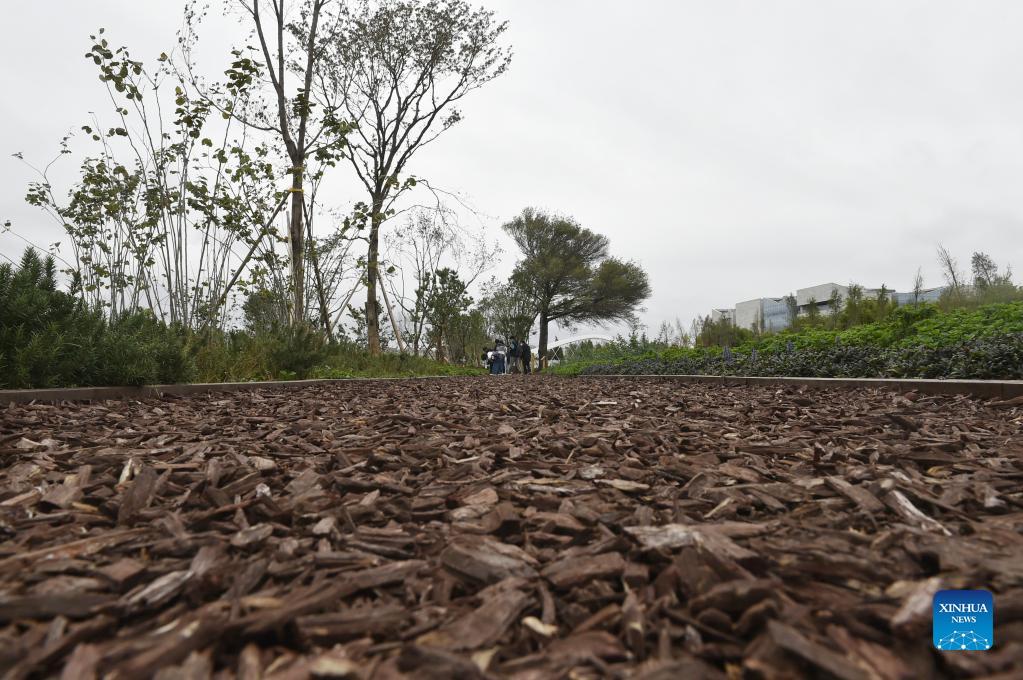 Journalists visit the Baofeng Peninsula Wetland in Kunming, southwest China's Yunnan Province, Oct. 15, 2021. The wetland, about 108 hectares in size, is an outdoor exhibition project for the 15th meeting of the Conference of the Parties to the Convention on Biological Diversity, or the COP15. (Xinhua/Lu Peng)
