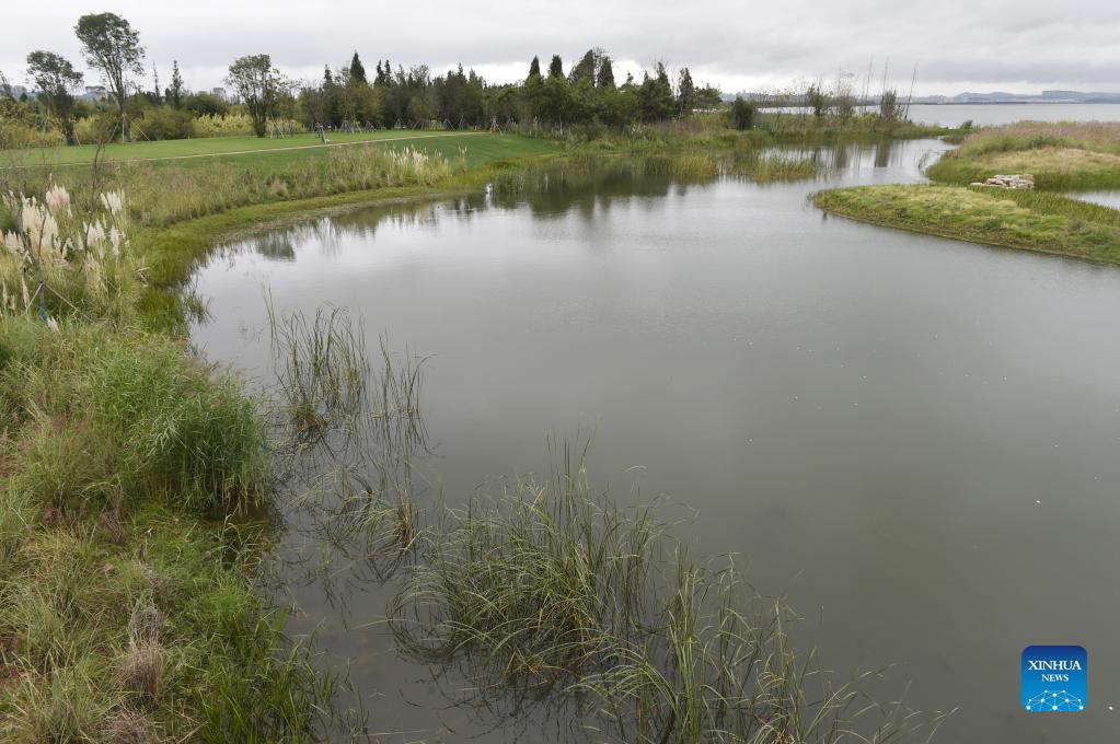 Photo taken on Oct. 15, 2021 shows a view of the Baofeng Peninsula Wetland in Kunming, southwest China's Yunnan Province. The wetland, about 108 hectares in size, is an outdoor exhibition project for the 15th meeting of the Conference of the Parties to the Convention on Biological Diversity, or the COP15. (Xinhua/Lu Peng)