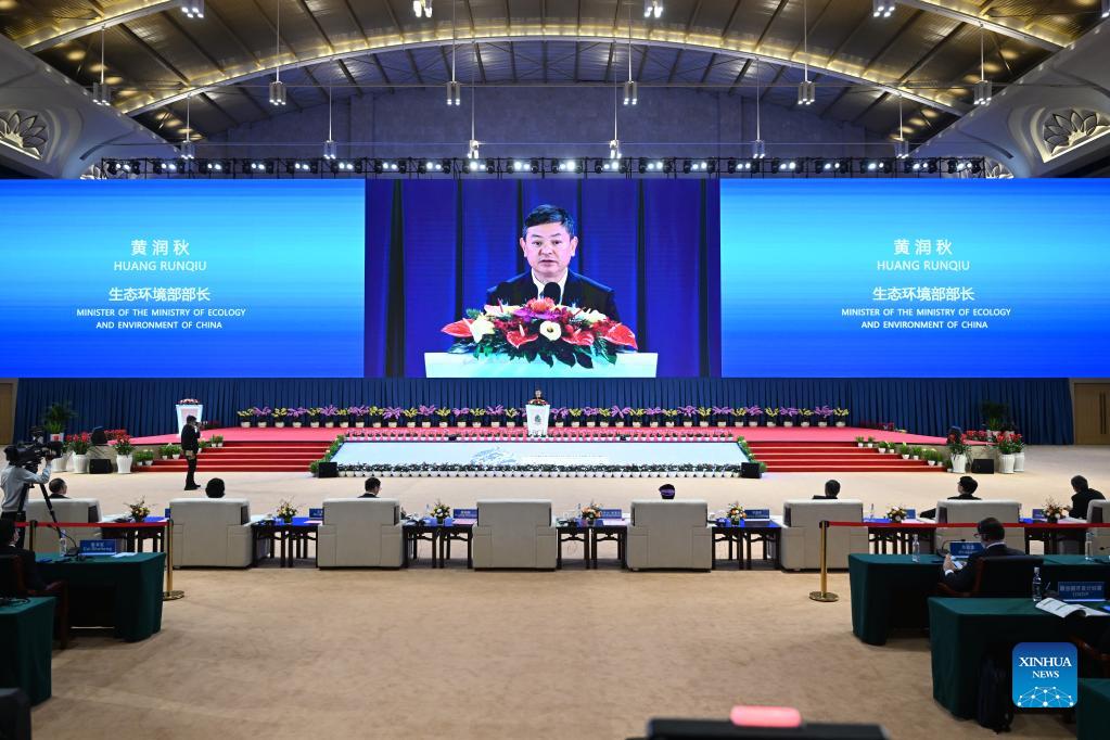Chinese Minister of Ecology and Environment Huang Runqiu speaks during the closing ceremony of the Ecological Civilization Forum of the first part of the Conference of the Parties to the Convention on Biological Diversity, or COP15, in Kunming, southwest China's Yunnan Province, Oct. 15, 2021. (Xinhua/Chen Yehua)