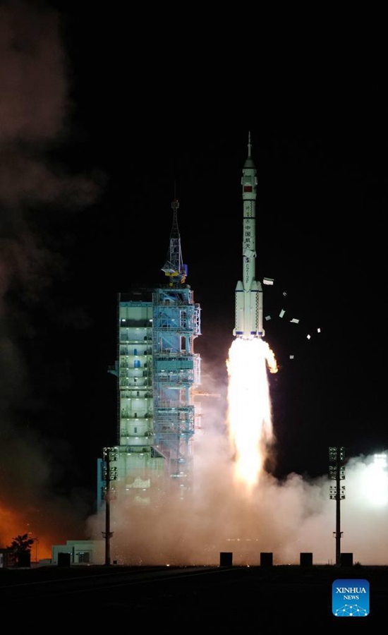 The crewed spaceship Shenzhou-13, atop a Long March-2F carrier rocket, is launched from the Jiuquan Satellite Launch Center in northwest China's Gobi Desert, Oct. 16, 2021. About 582 seconds after the launch, Shenzhou-13 separated from the rocket and entered its designated orbit. The crew members are in good shape and the launch is a complete success, the China Manned Space Agency declared. (Xinhua/Li Gang)
