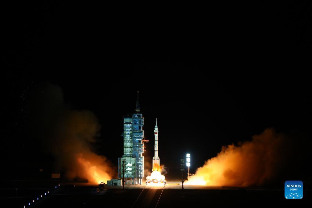 The crewed spaceship Shenzhou-13, atop a Long March-2F carrier rocket, is launched from the Jiuquan Satellite Launch Center in northwest China's Gobi Desert, Oct. 16, 2021. About 582 seconds after the launch, Shenzhou-13 separated from the rocket and entered its designated orbit. The crew members are in good shape and the launch is a complete success, the China Manned Space Agency declared. (Xinhua/Ju Zhenhua)