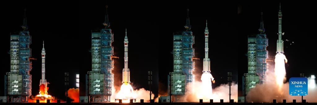 The combo photo shows the crewed spaceship Shenzhou-13, atop a Long March-2F carrier rocket, being launched from the Jiuquan Satellite Launch Center in northwest China's Gobi Desert, Oct. 16, 2021. About 582 seconds after the launch, Shenzhou-13 separated from the rocket and entered its designated orbit. The crew members are in good shape and the launch is a complete success, the China Manned Space Agency declared. (Xinhua/Li Gang)