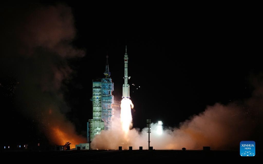 The crewed spaceship Shenzhou-13, atop a Long March-2F carrier rocket, is launched from the Jiuquan Satellite Launch Center in northwest China's Gobi Desert, Oct. 16, 2021. (Xinhua/Li Gang)
