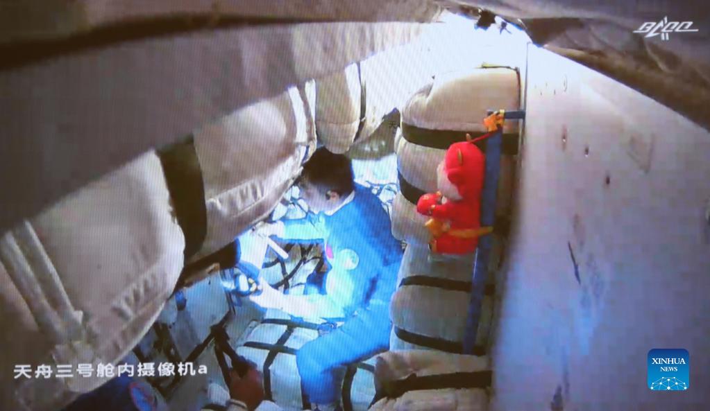 Screen image captured at Beijing Aerospace Control Center in Beijing, capital of China, Oct. 17, 2021 shows the Shenzhou-13 crew entering the Tianzhou-3 cargo craft. The Shenzhou-13 crew has entered the Tianzhou-3 cargo craft to transfer the cargo, according to the China Manned Space Agency (CMSA) on Sunday. After successfully stationing in China's space station core module Tianhe, the Shenzhou-13 crew opened the hatch of the Tianzhou-3 cargo craft and entered it at 9:50 a.m. (Beijing Time), the CMSA said. The crew will also open the hatch of the Tianzhou-2 cargo craft. They will carry out cargo transfer and other related work as planned. (Photo by Zhao Yuliang/Xinhua)