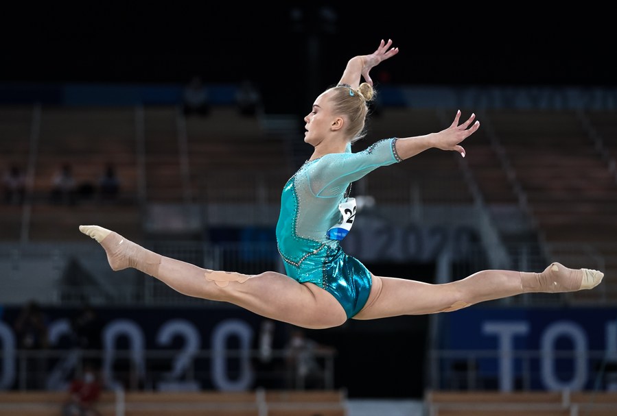 Angelina Melnikova of the Russian Olympic Committee (ROC) competes in the women's floor exercise final at the Tokyo 2020 Olympic Games, Aug. 2, 2021. (Xinhua/Cheng Min)