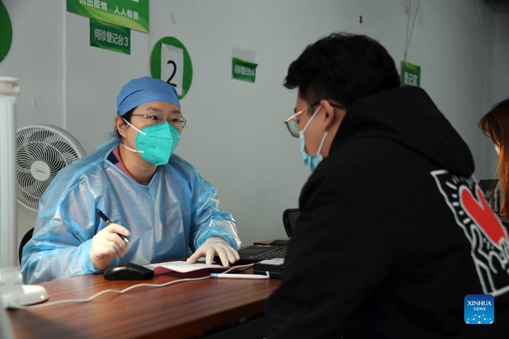 A medical worker asks a man about his physical condition at a vaccination site in Xicheng District of Beijing, capital of China, Oct. 17, 2021. Beijing has begun to offer a third COVID-19 booster vaccine to people of higher risks in some neighborhoods. (Xinhua/Ren Chao)
