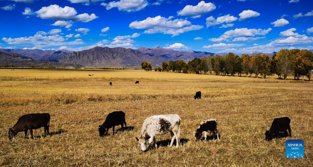 Photo taken with a mobile phone shows the autumn scenery in Lhunzhub County of Lhasa, southwest China's Tibet Autonomous Region, Oct. 16, 2021. (Xinhua/Shen Hongbing)