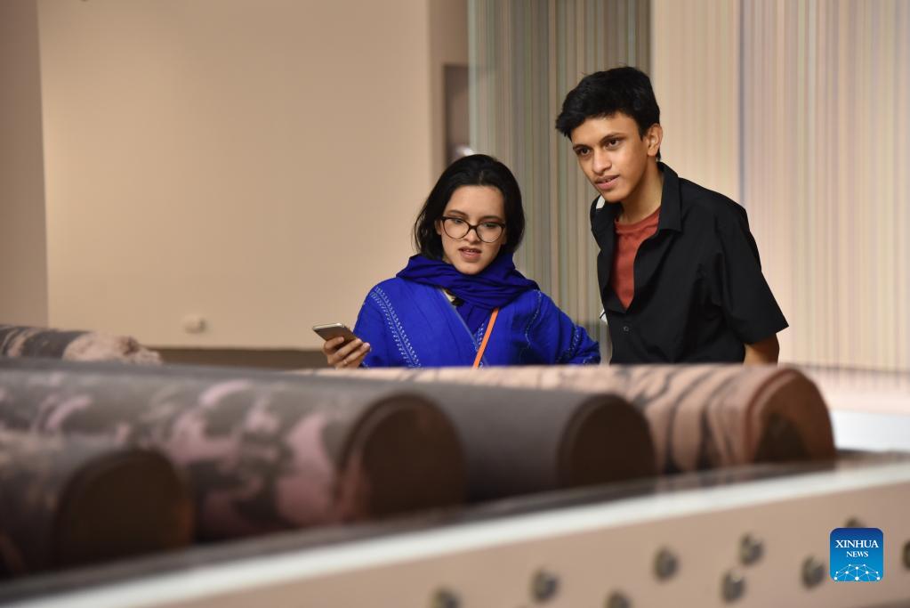 Visitors watch an art work at the BIENALSUR exhibition in JAX, Diriyah, Riyadh, Saudi Arabia, on Oct. 16, 2021. The exhibition opened for public on Saturday in Diriyah under the title "Echoes: A World Between Analogue &Virtual". (Xinhua/Wang Haizhou)