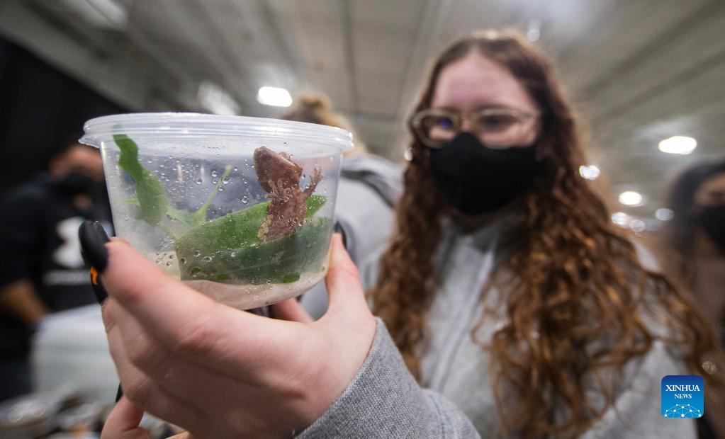 A woman looks at a gecko during the 2021 Toronto Reptile Expo at the International Center in Mississauga, the Greater Toronto Area, Canada, on Oct. 17, 2021. Kicking off on Sunday, this event provided an opportunity to view species of reptilian specialty pets from across Canada. (Photo by Zou Zheng/Xinhua)