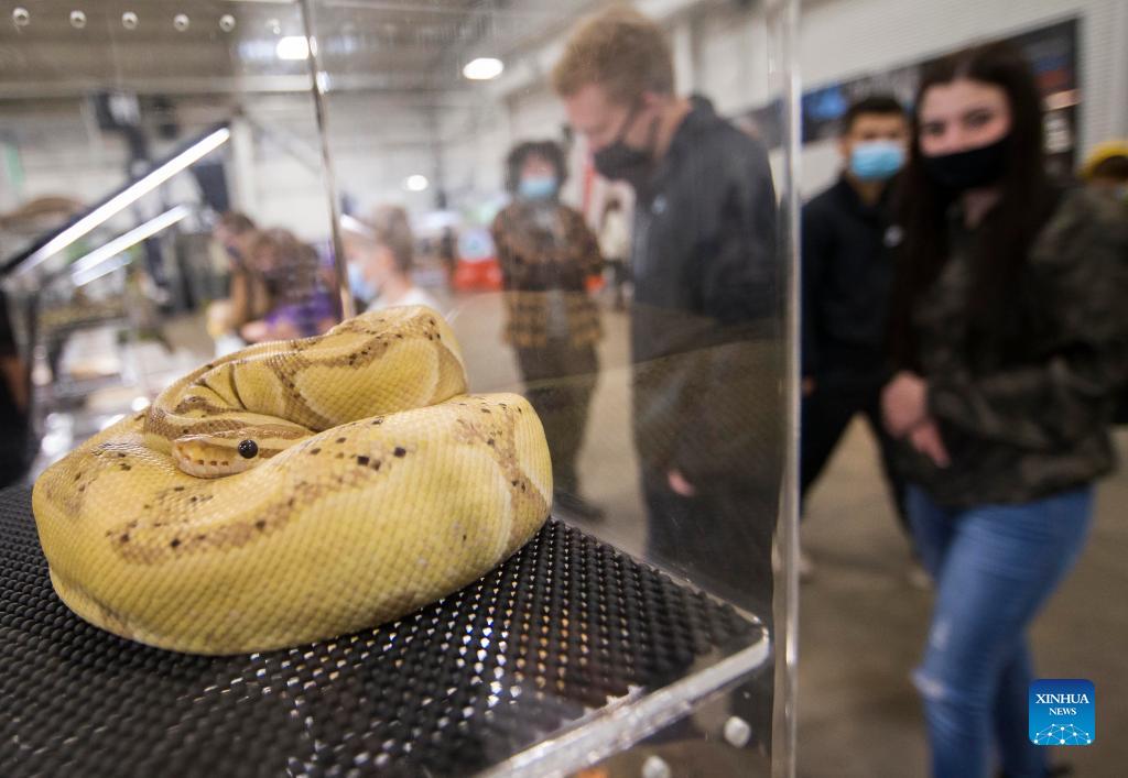 People look at a pet snake during the 2021 Toronto Reptile Expo at the International Center in Mississauga, the Greater Toronto Area, Canada, on Oct. 17, 2021. Kicking off on Sunday, this event provided an opportunity to view species of reptilian specialty pets from across Canada. (Photo by Zou Zheng/Xinhua)