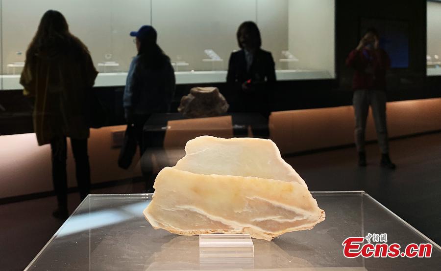 Photo taken on Oct. 17 shows a piece of raw jade at the Lajia Ruins Museum, Minhe County, northwest China's Qinghai. Lajia Ruins, dubbed "Pompeii of China," was formed by an earthquake and flood dating back 4,000 years. The Lajia site is the largest disaster excavation site found in China so far. (Photo: China News Service/ Ma Mingyan)