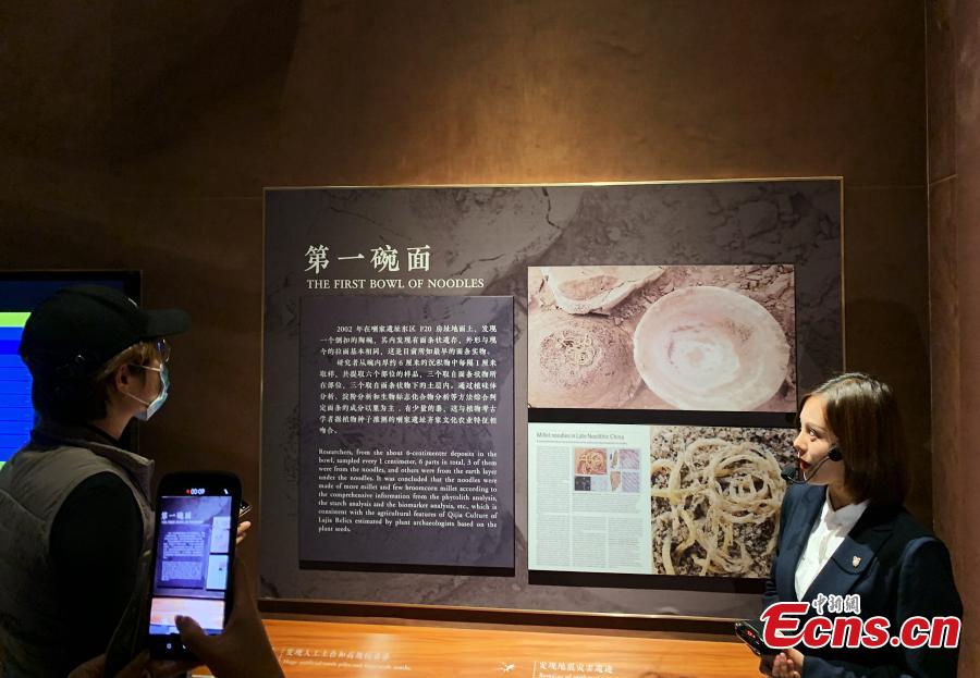 A guide introduces the world's oldest noodles to visitors on Oct. 17 at the Lajia Ruins Museum, Minhe County, northwest China's Qinghai. Lajia Ruins, dubbed "Pompeii of China," was formed by an earthquake and flood dating back 4,000 years. The Lajia site is the largest disaster excavation site found in China so far. (Photo: China News Service/ Ma Mingyan)