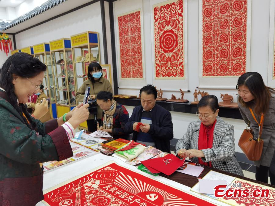 Craftswomen create papercuts at a local exhibition in Lanzhou, Guasu Province, Oct. 17, 2021.