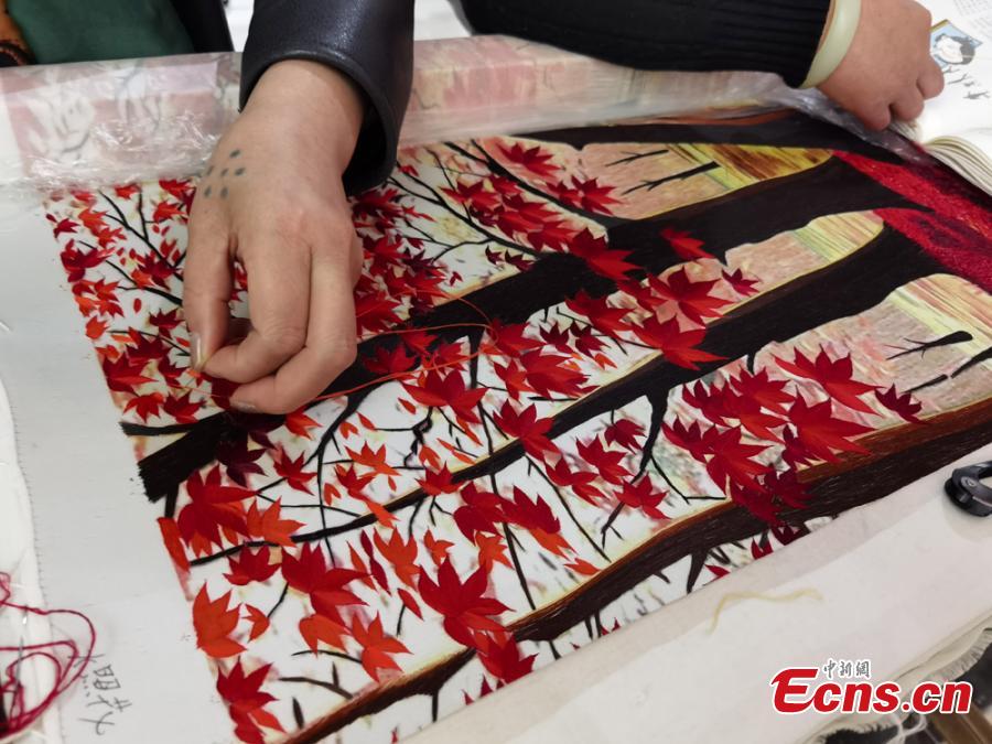 A craftswoman embroiders at a local exhibition in Lanzhou, Guasu Province, Oct. 17, 2021.