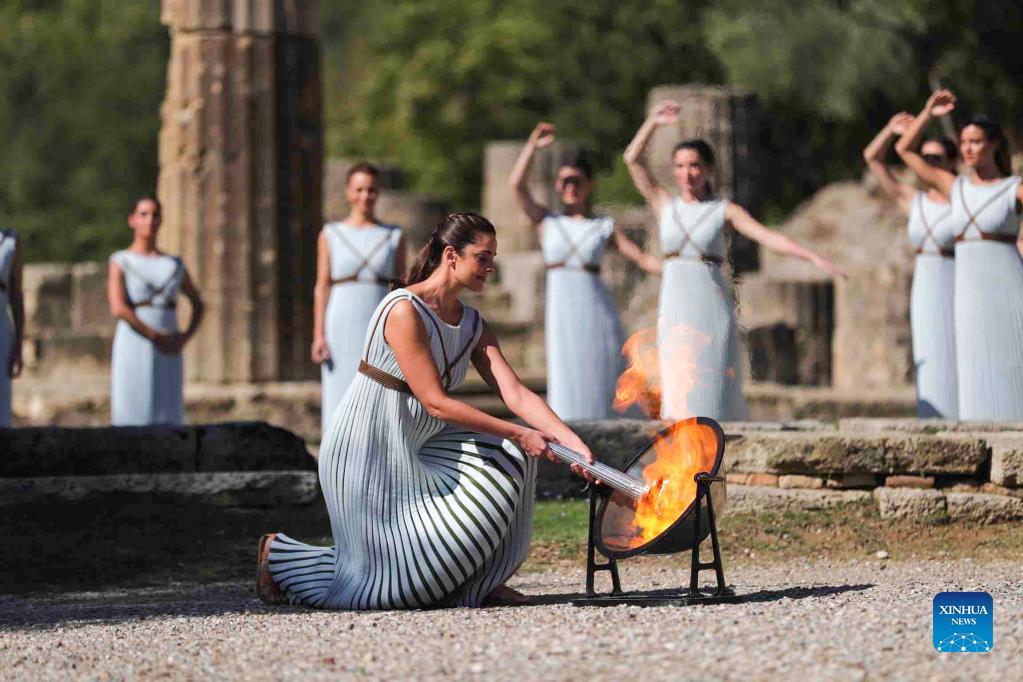 Greek actress Xanthi Georgiou, playing the role of an ancient Greek High Priestess, lights the torch during the Olympic flame lighting ceremony for the Beijing 2022 Winter Olympic Games, in ancient Olympia, Greece, Oct. 18, 2021. (Xinhua/Zheng Huansong)