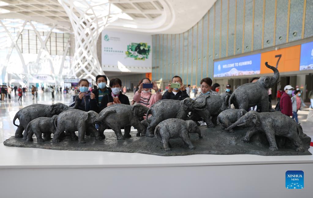 People visit the Kunming Dianchi International Convention &Exhibition Center, a venue of the 15th meeting of the Conference of the Parties to the United Nations Convention on Biological Diversity (COP15), in Kunming, southwest China's Yunnan Province, Oct. 18, 2021. Venues of the COP15 are opened to the public free of charge from Oct. 18 to Nov. 7. (Photo by Liang Zhiqiang/Xinhua)