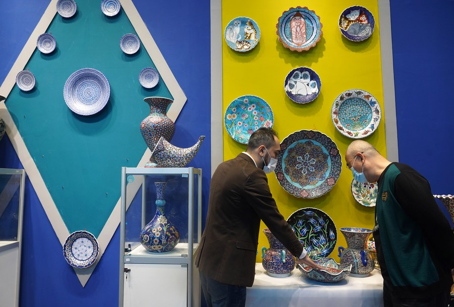 A Turkish exhibitor (L) introduces exhibits to a visitor at the 2021 China Jingdezhen International Ceramic Fair in Jingdezhen, east China's Jiangxi Province, Oct. 18, 2021. (Xinhua/Wan Xiang)