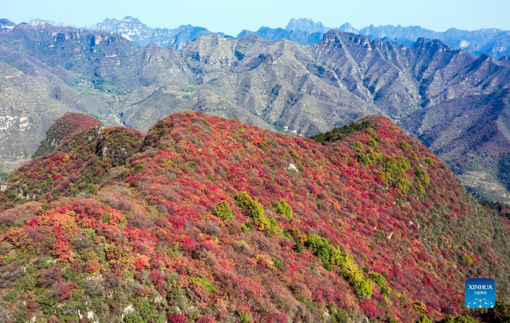 Aerial photo taken on Oct. 18, 2021 shows the autumn scenery at Baiyun mountain scenic spot in Wuan City, north China's Hebei Province. (Xinhua/Luo Xuefeng)