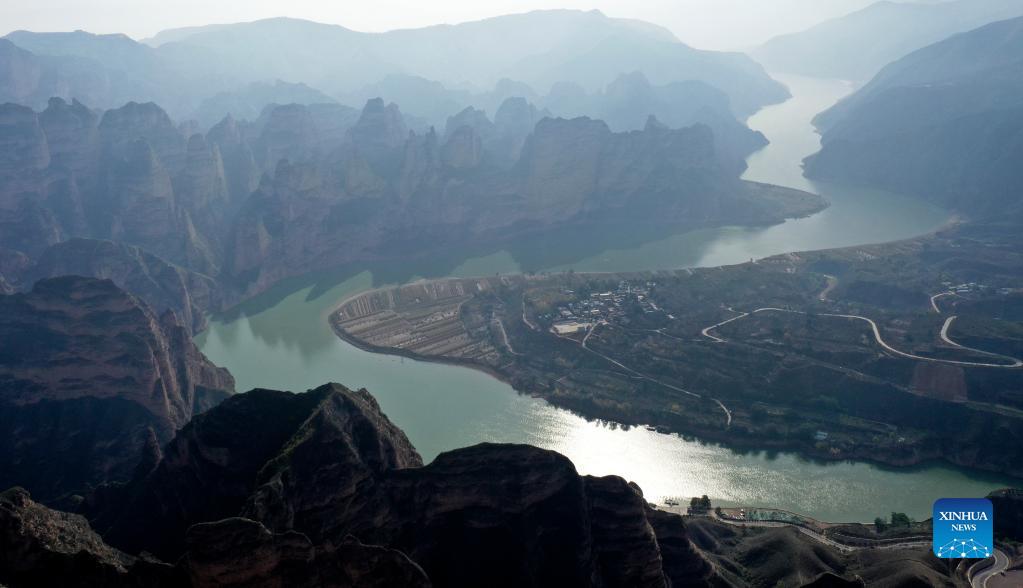 Aerial photo taken on Oct. 18, 2021 shows the scenery at Bingling Danxia National Geological Park in Yongjing County, northwest China's Gansu Province. (Photo by Shi Youdong/Xinhua)