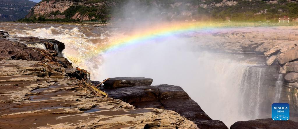 Photo taken on Oct. 18, 2021 shows a rainbow over the Yellow River's Hukou Waterfall in northwest China's Shaanxi Province. (Xinhua/Zhu Xiang)