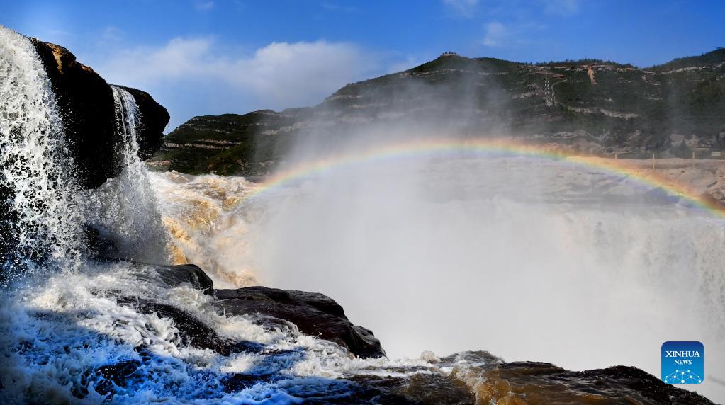 Photo taken on Oct. 18, 2021 shows a rainbow over the Yellow River's Hukou Waterfall in northwest China's Shaanxi Province. (Xinhua/Tao Ming)