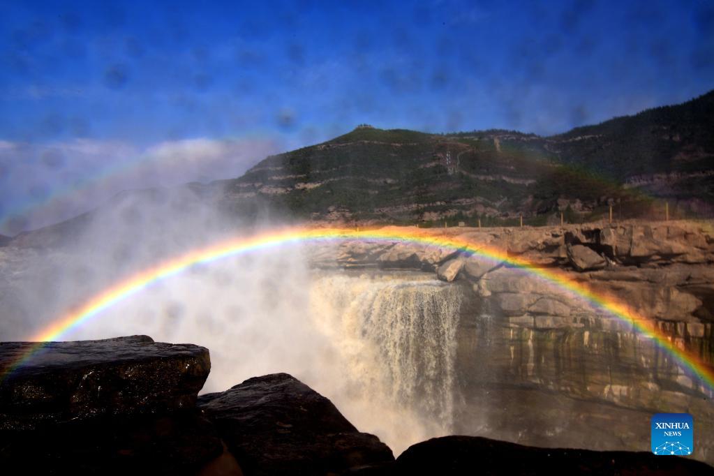 Photo taken on Oct. 18, 2021 shows a rainbow over the Yellow River's Hukou Waterfall in northwest China's Shaanxi Province. (Xinhua/Zhu Xiang)
