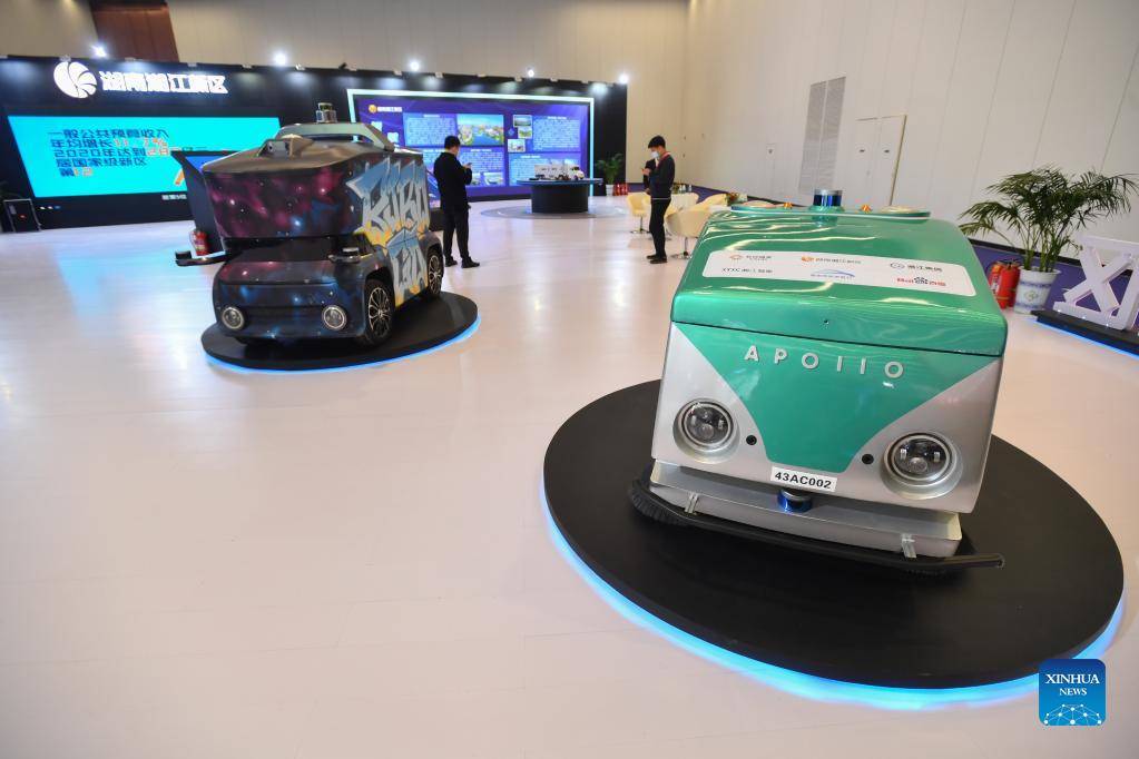 Photo taken on Oct. 18, 2021 shows an exhibition area during the Global Economic Development and Security Forum Expo of the Boao Forum for Asia (BFA) in Changsha, central China's Hunan Province. With the theme of economic security and sustainable development in a world of great change, the three-day forum aims to provide a high-end platform for promoting dialogue between political and business leaders from around the world. (Xinhua/Chen Zeguo)