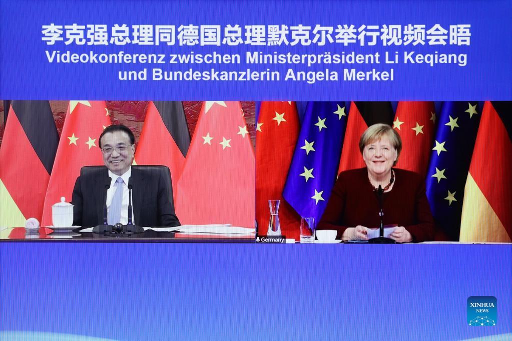 BEIJING, Oct. 18 (Xinhua) -- Chinese Premier Li Keqiang met with German Chancellor Angela Merkel via video link on Monday, vowing that China stands ready to work with Germany to tackle global challenges.