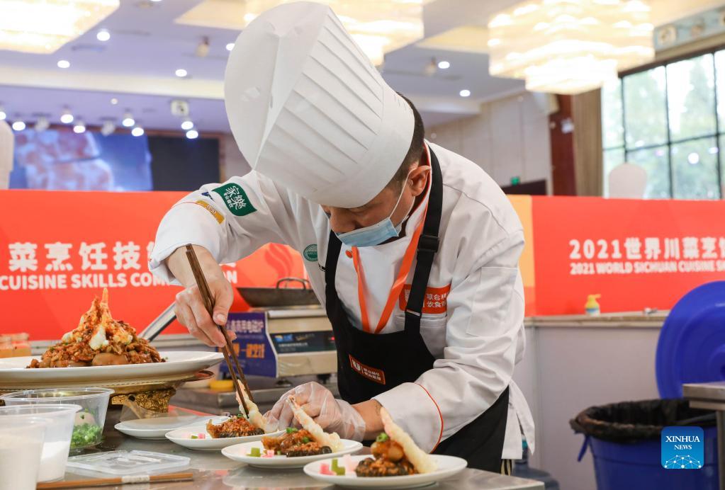 A chef prepares dishes during a Sichuan cuisine skills competition in Chengdu, capital of southwest China's Sichuan Province, Oct. 18, 2021. The 2021 World Sichuan Cuisine Conference kicked off on Monday in Pidu District of Chengdu City, during which chefs show the trending culinary skills of Sichuan cuisines. (Xinhua/Jiang Hongjing)