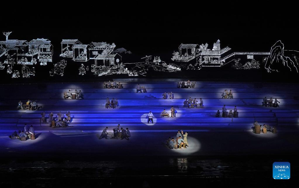 Photo taken on Oct. 17, 2021 shows a scene from the debut of "china," a live-action performance, in Jingdezhen City, east China's Jiangxi Province. The performance artistically reflects the thousand-year development of porcelain making and the history of Jingdezhen, dubbed the ancient porcelain capital of the country. (Xinhua/Wan Xiang)