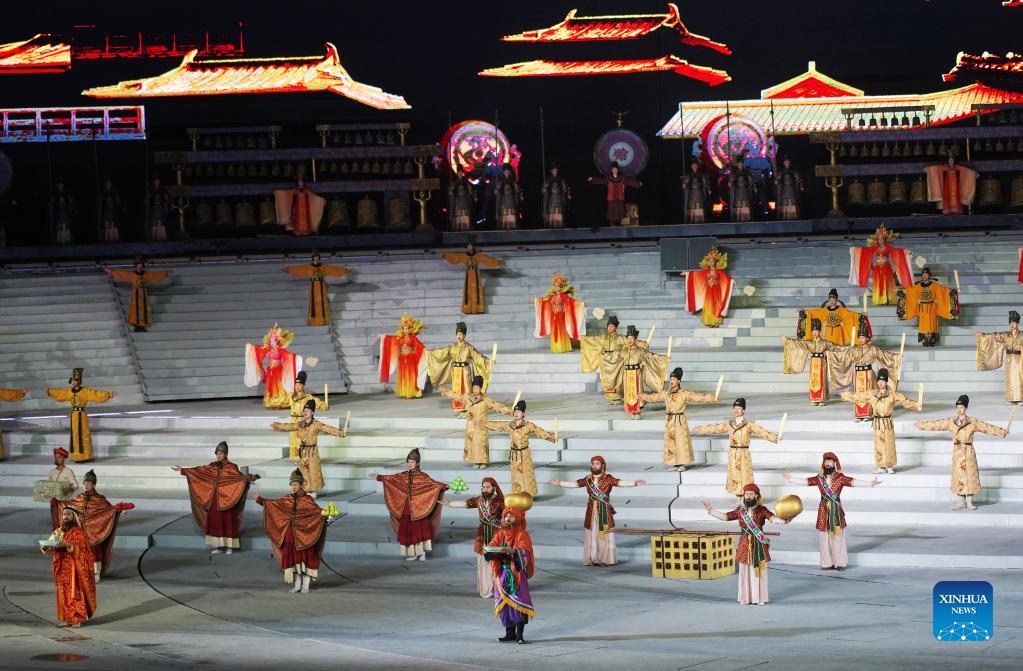 Photo taken on Oct. 17, 2021 shows a scene from the debut of "china," a live-action performance, in Jingdezhen City, east China's Jiangxi Province. The performance artistically reflects the thousand-year development of porcelain making and the history of Jingdezhen, dubbed the ancient porcelain capital of the country. (Xinhua/Wan Xiang)