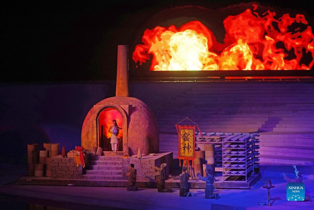 Photo taken on Oct. 17, 2021 shows a scene from the debut of "china," a live-action performance, in Jingdezhen City, east China's Jiangxi Province. The performance artistically reflects the thousand-year development of porcelain making and the history of Jingdezhen, dubbed the ancient porcelain capital of the country. (Xinhua/Wan Xiang)