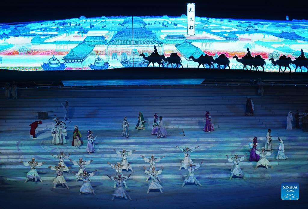 Photo taken on Oct. 17, 2021 shows a scene from the debut of "china," a live-action performance, in Jingdezhen City, east China's Jiangxi Province. The performance artistically reflects the thousand-year development of porcelain making and the history of Jingdezhen, dubbed the ancient porcelain capital of the country. (Xinhua/Wan Xiang)