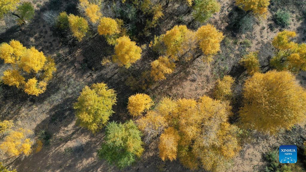 Aerial photo taken on Oct. 15, 2021 shows the autumn scenery at Haba Lake nature reserve of Yanchi County, northwest China's Ningxia Hui Autonomous Region. (Xinhua/Wang Peng)