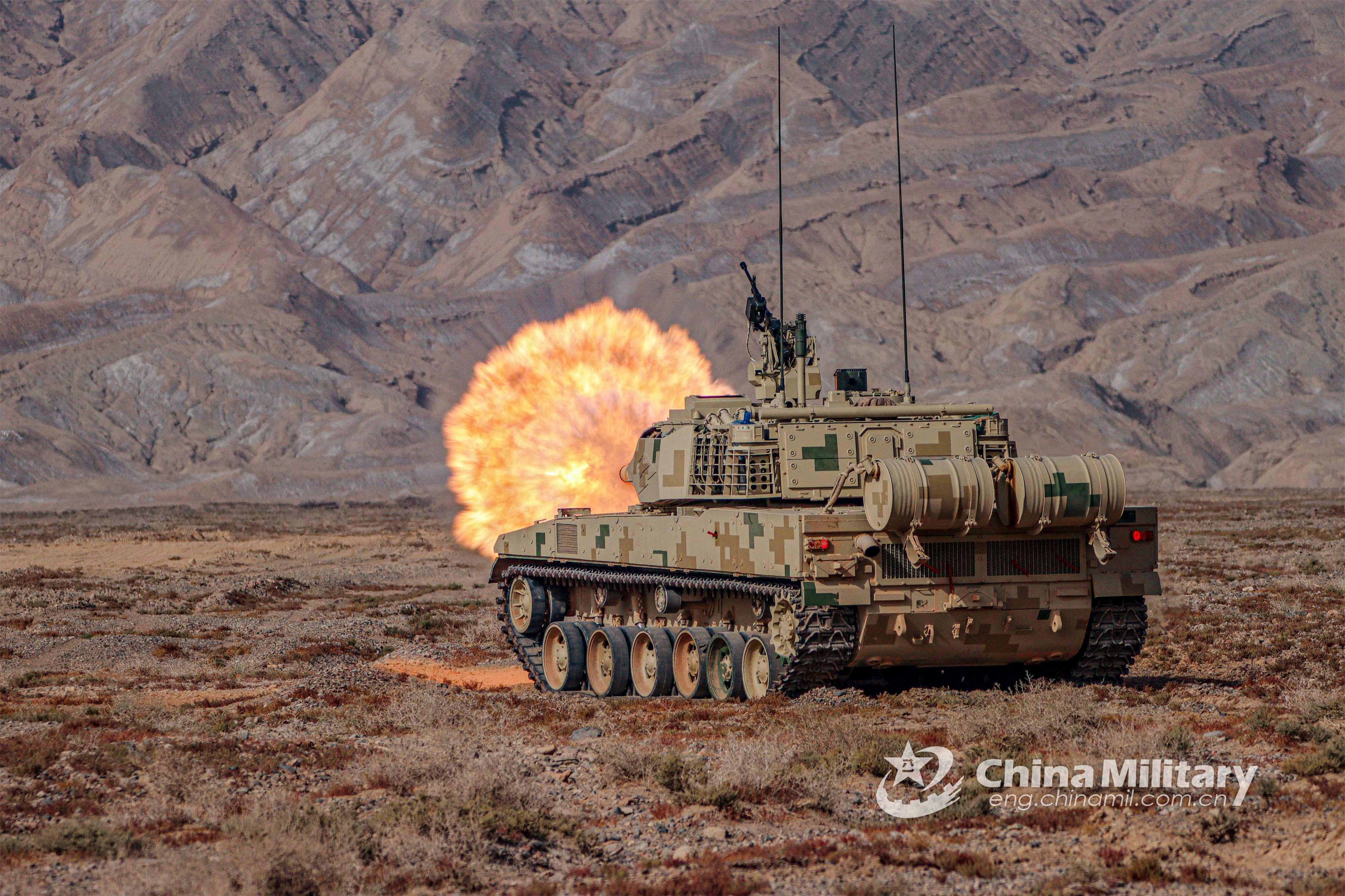 A main battle tank (MBT) attached to a combined-arms regiment under the PLA Xinjiang Military Command fires its main gun at mock targets during a live-fire training exercise on September 27, 2021. (eng.chinamil.com.cn/Photo by Chen Ming)