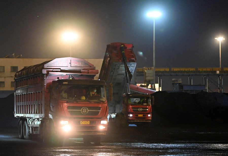Trucks operate at the coal dock in Tianjin Port of north China's Tianjin, Oct. 11, 2021. (Xinhua/Li Ran)