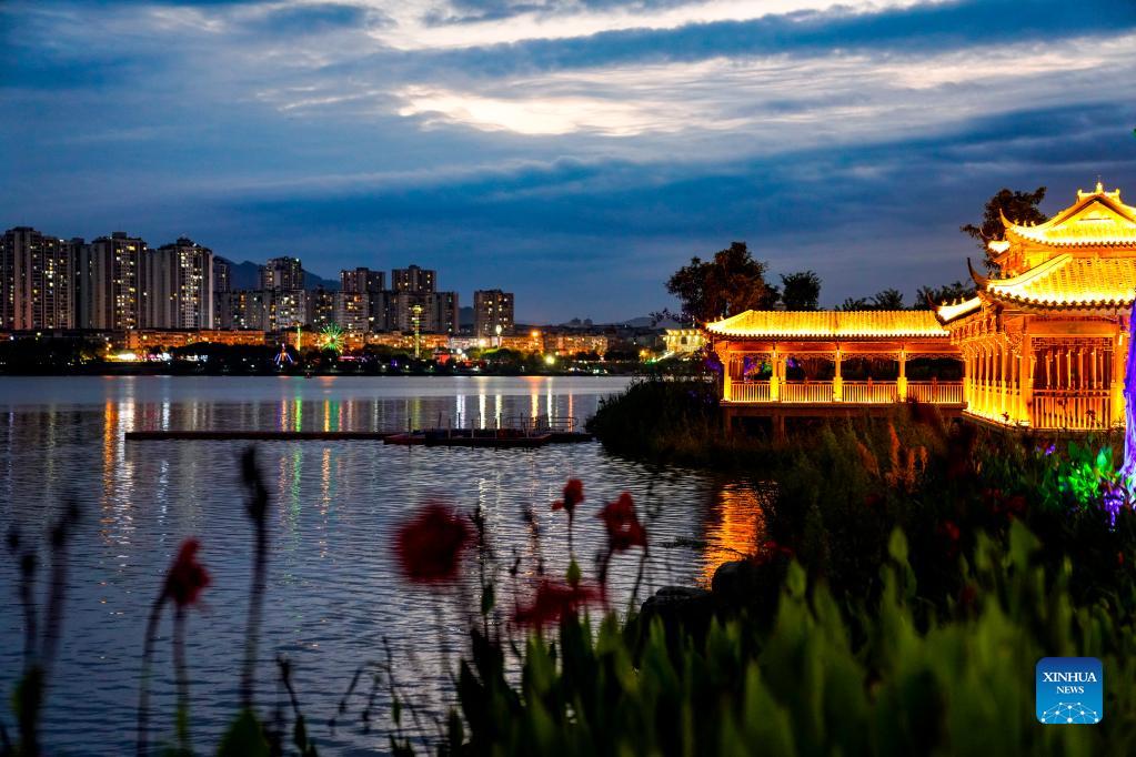 Photo taken on Oct. 18, 2021 shows the night scenery of Hanfeng Lake in Kaizhou District of Chongqing, southwest China. (Xinhua/Liu Chan)